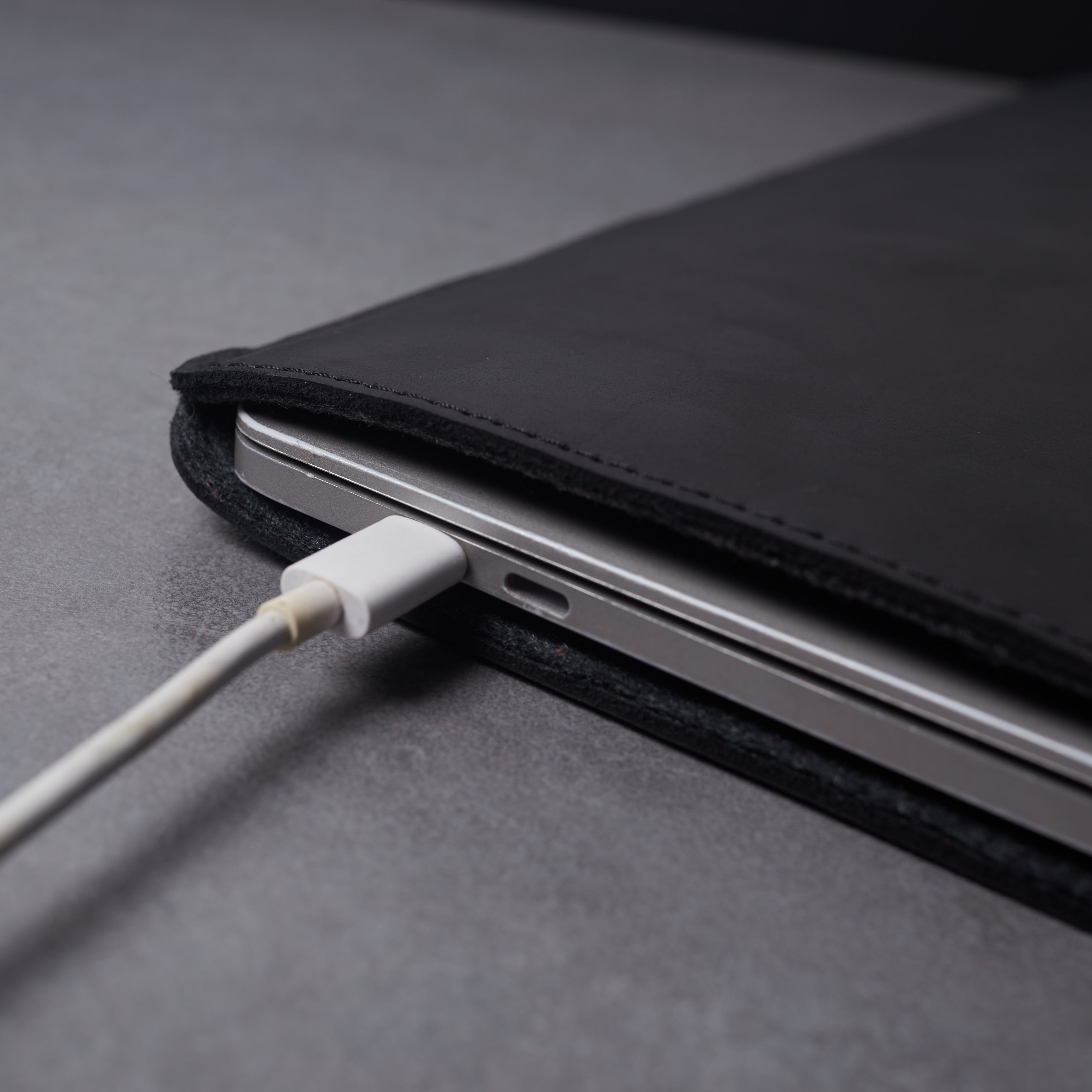 In the Free Port Plus laptop sleeve by INCARNE™, MacBook ports remain accessible for charging. The soft felt lining offers extra protection for the laptop's body.