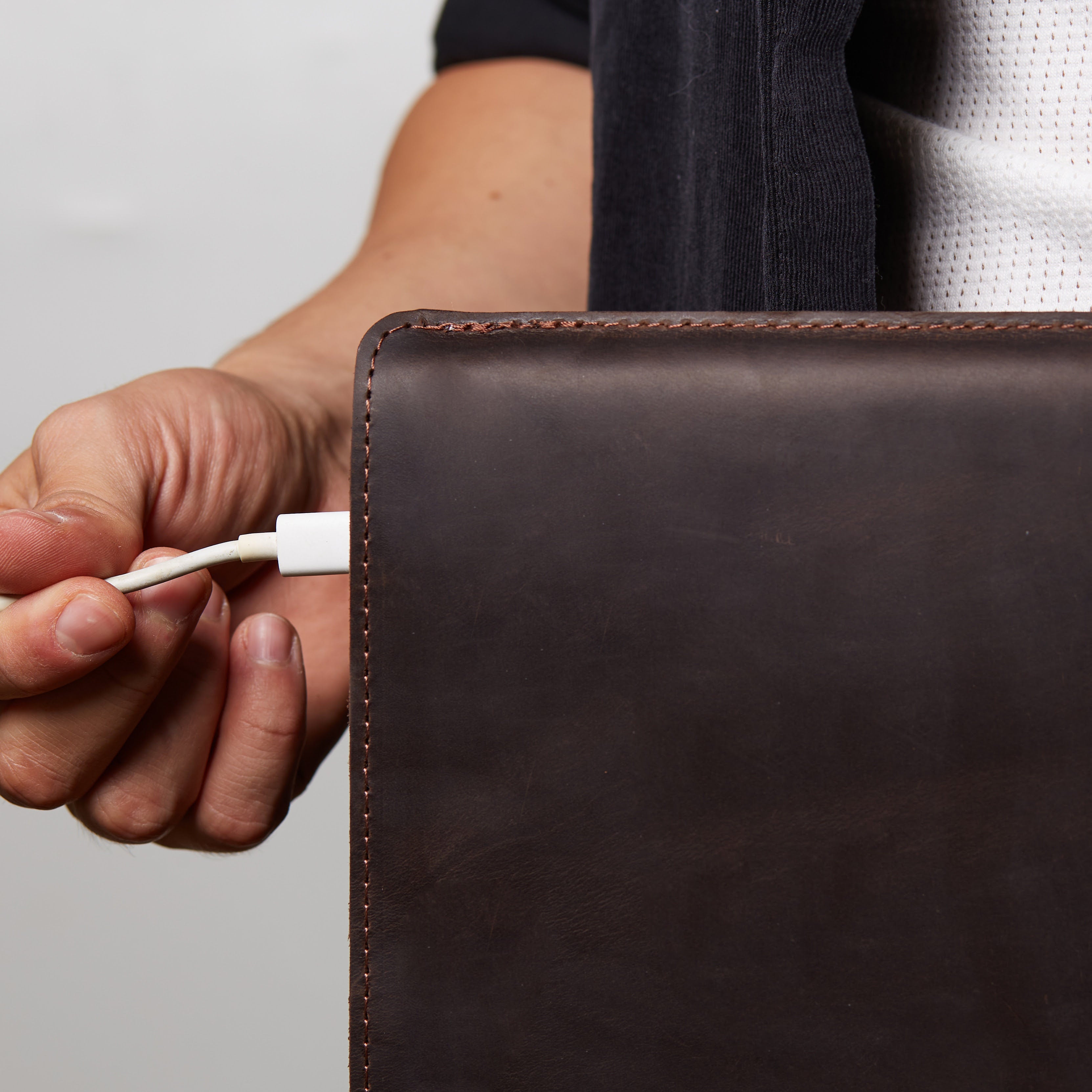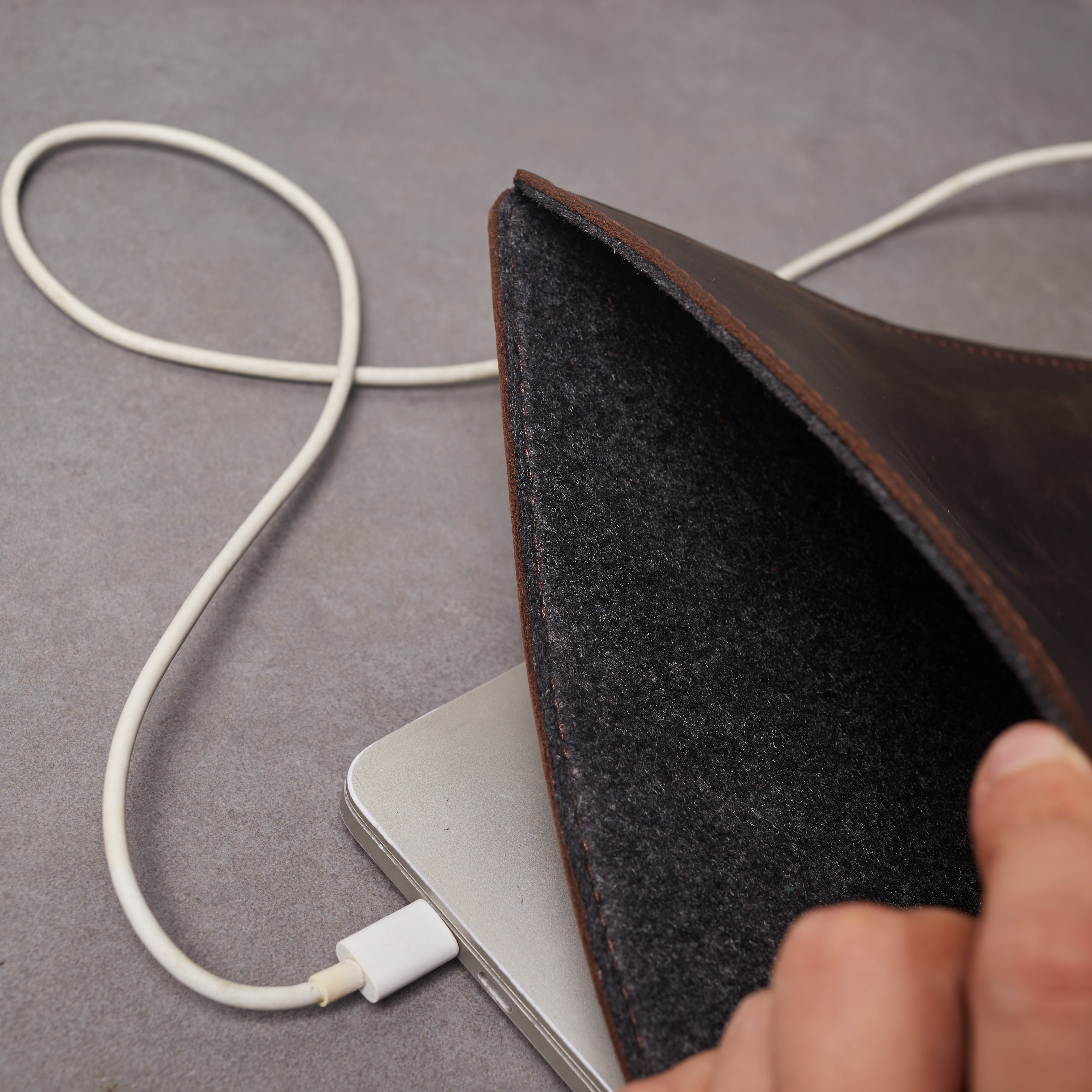 The Free Port Plus laptop sleeve by INCARNE™ is crafted from genuine vintage leather in an elegant brown shade. Designed for MacBook and other laptops, it features a minimalist silhouette and allows charging without removing the device. A soft felt lining ensures reliable protection from scratches and impact.
