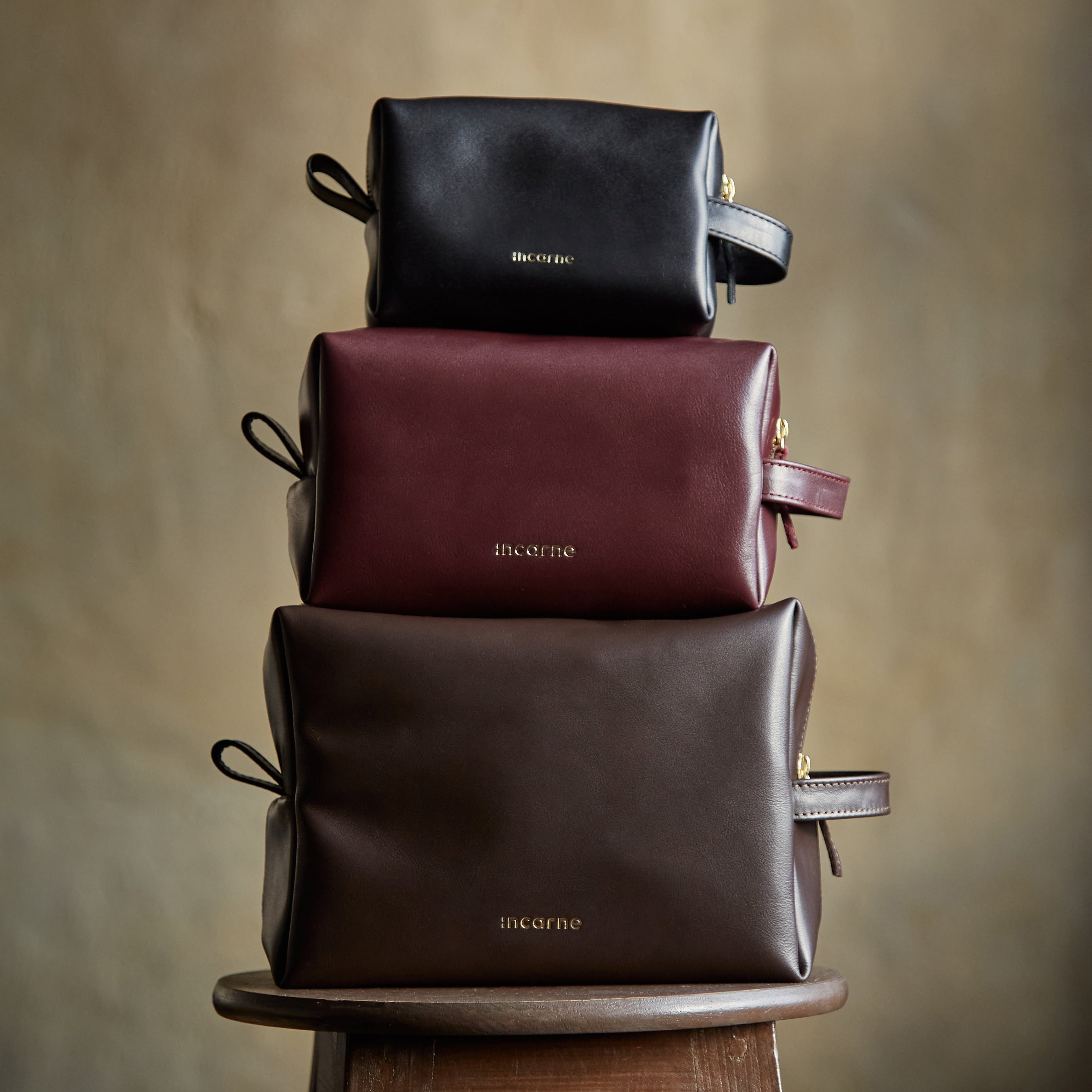 Each red cosmetic bag is elegantly finished with a brass-colored YKK zipper and a gold-embossed INCARNE™ logo. A sturdy handle ensures comfortable use. The interior features a roomy compartment lined with moisture-resistant sand-colored fabric and includes a small pocket for added convenience.