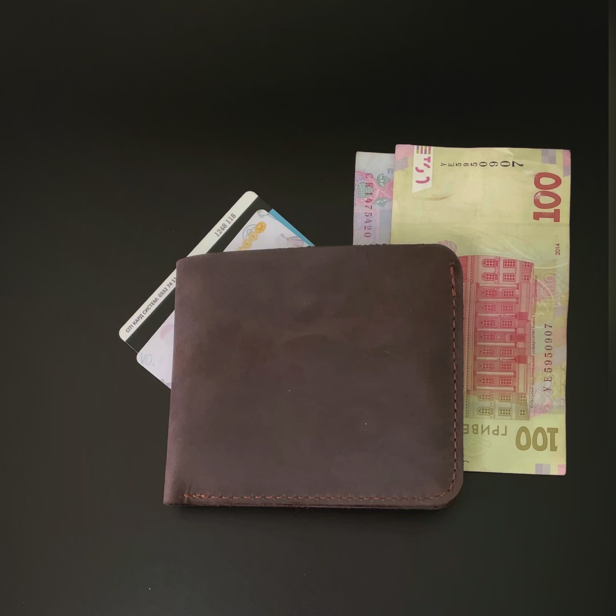 This wallet has two bill compartments, three card slots, and a coin pouch that fastens with a press stud.