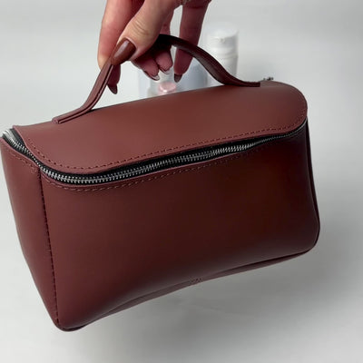 Skórzana kosmetyczka dla mężczyzn i kobiet w eleganckim brązowym odcieniu Timeless. Projekt jest praktyczny i minimalistyczny. Kosmetyczka zamykana na zamek błyskawiczny, wyposażona w wygodny górny uchwyt. Wnętrze bez podszewki, uzupełnione dodatkową wewnętrzną kieszonką na drobiazgi.